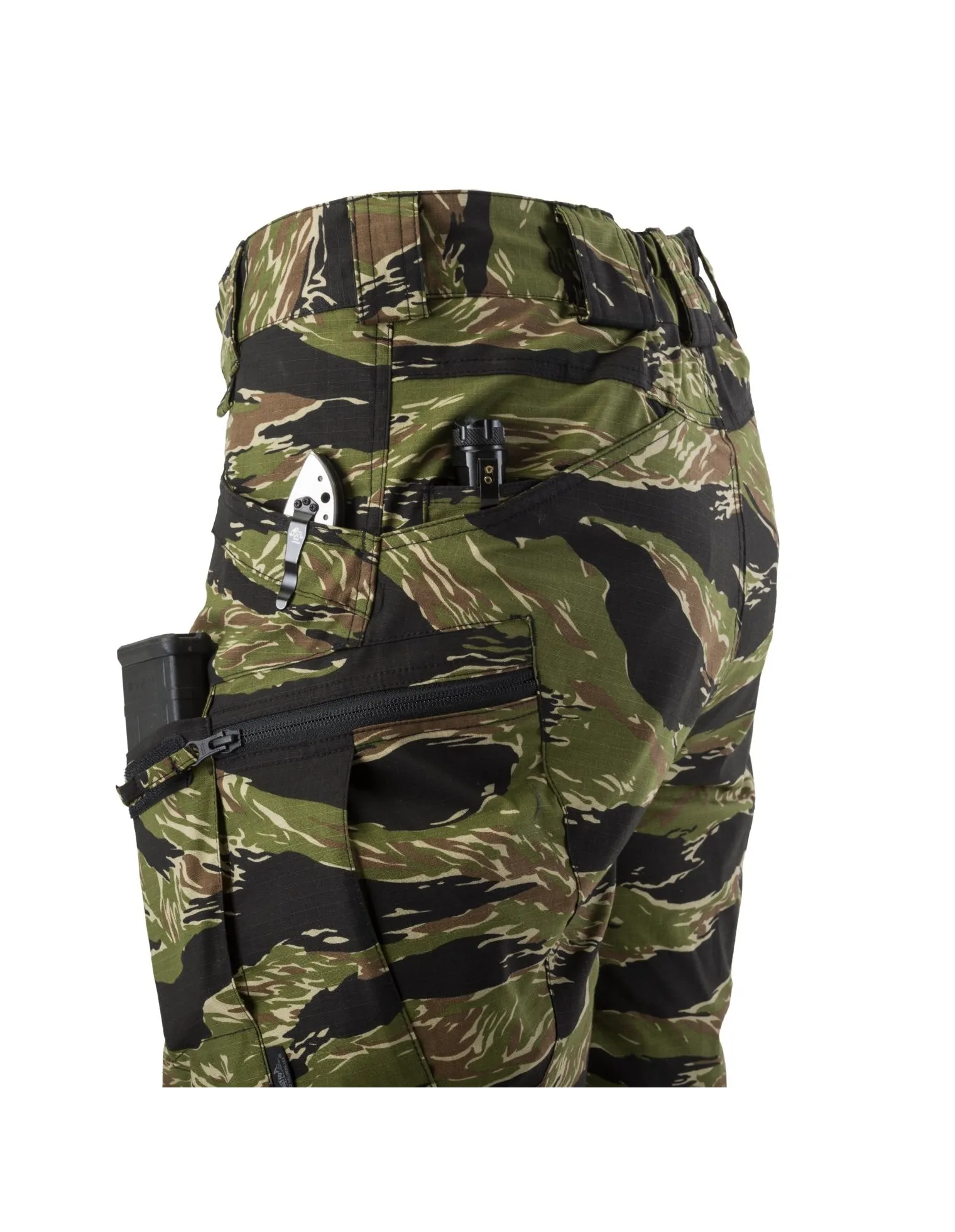 Mediante una disposición juiciosa de los bolsillos, el equipo se puede colocar cerca del centro de la masa, alrededor de las caderas y la cintura. Los bordes de los bolsillos delanteros y traseros están reforzados para resistir el movimiento constante de la luz o los clips para cuchillos. Dos bolsillos frontales con velcro son lo suficientemente grandes como para llevar un teléfono inteligente, o incluso un cargador de rifle AR / AK. Los bolsillos con cremallera en los muslos se ven planos, pero su diseño permite llevar bolsas o carteras con facilidad.