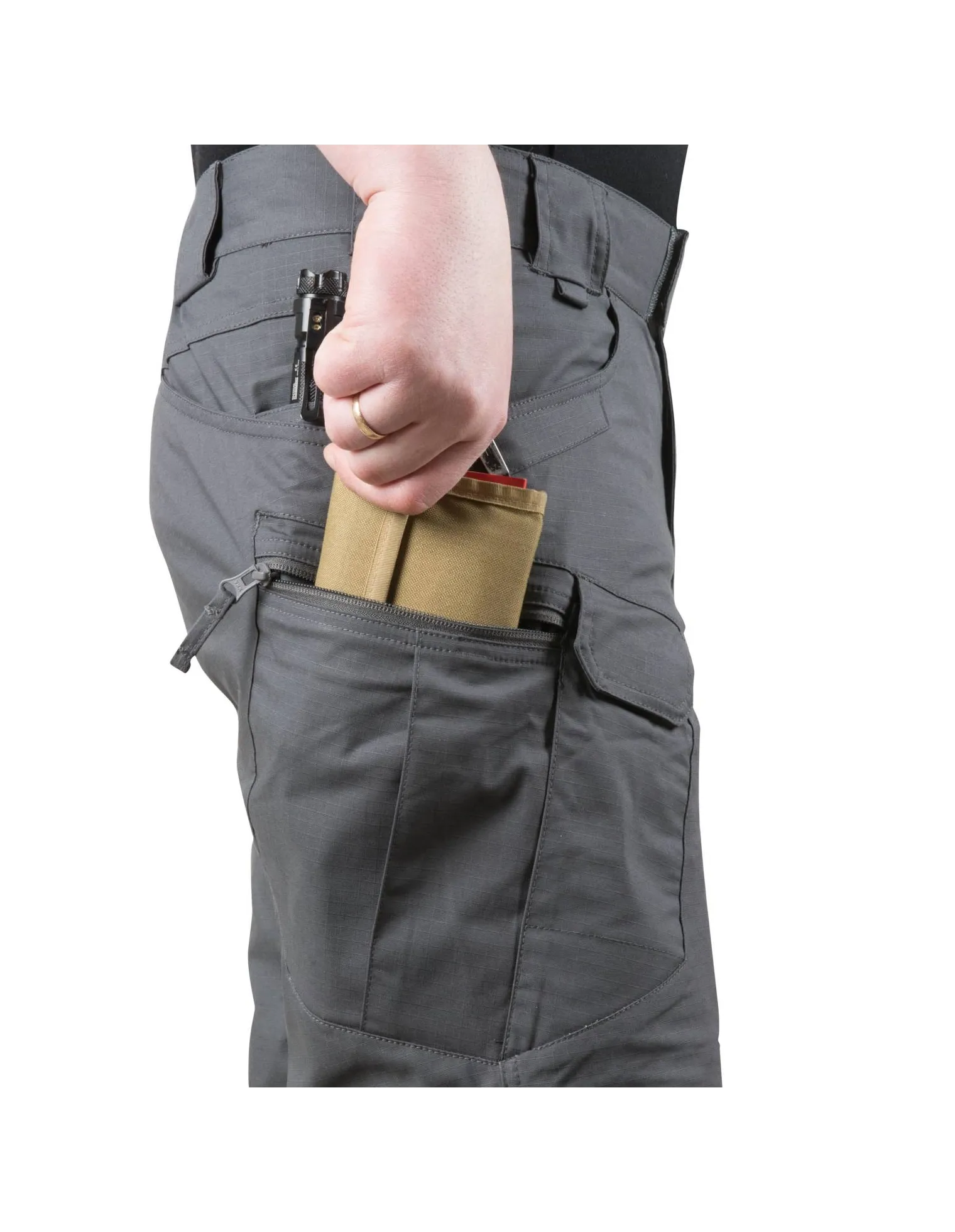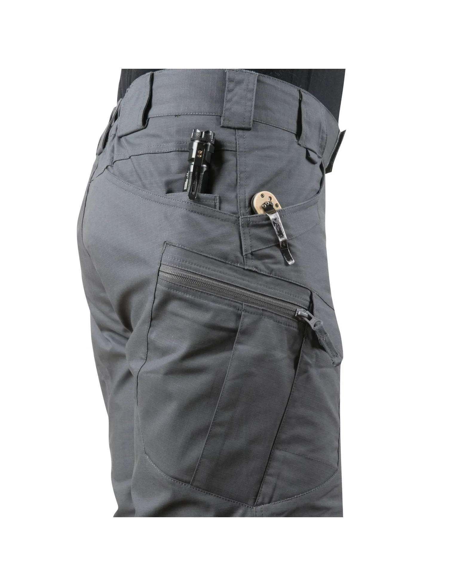 Mediante una disposición juiciosa de los bolsillos, el equipo se puede colocar cerca del centro de la masa, alrededor de las caderas y la cintura. Los bordes de los bolsillos delanteros y traseros están reforzados para resistir el movimiento constante de la luz o los clips para cuchillos. Dos bolsillos frontales con velcro son lo suficientemente grandes como para llevar un teléfono inteligente, o incluso un cargador de rifle AR / AK. Los bolsillos con cremallera en los muslos se ven planos, pero su diseño permite llevar bolsas o carteras con facilidad. Una amplia variedad de colores permite combinar los pantalones cortos con el resto de vestuario o condiciones de trabajo.