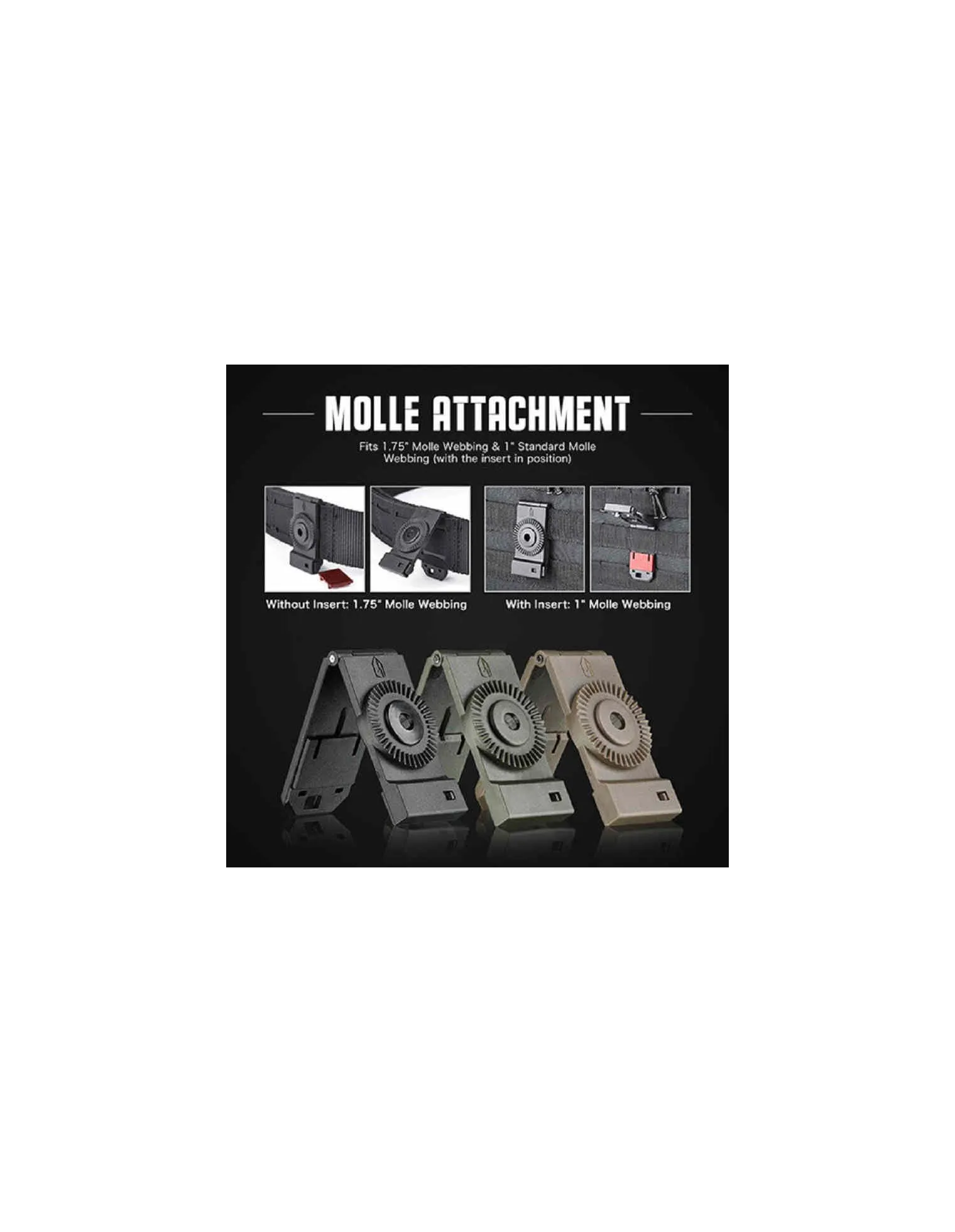 Puede colocarse en paneles Molle de 1" y 1,75" con el adaptador que lleva incluido. Además, su sistema dentado permite la rotación de la funda que queramos colocar.