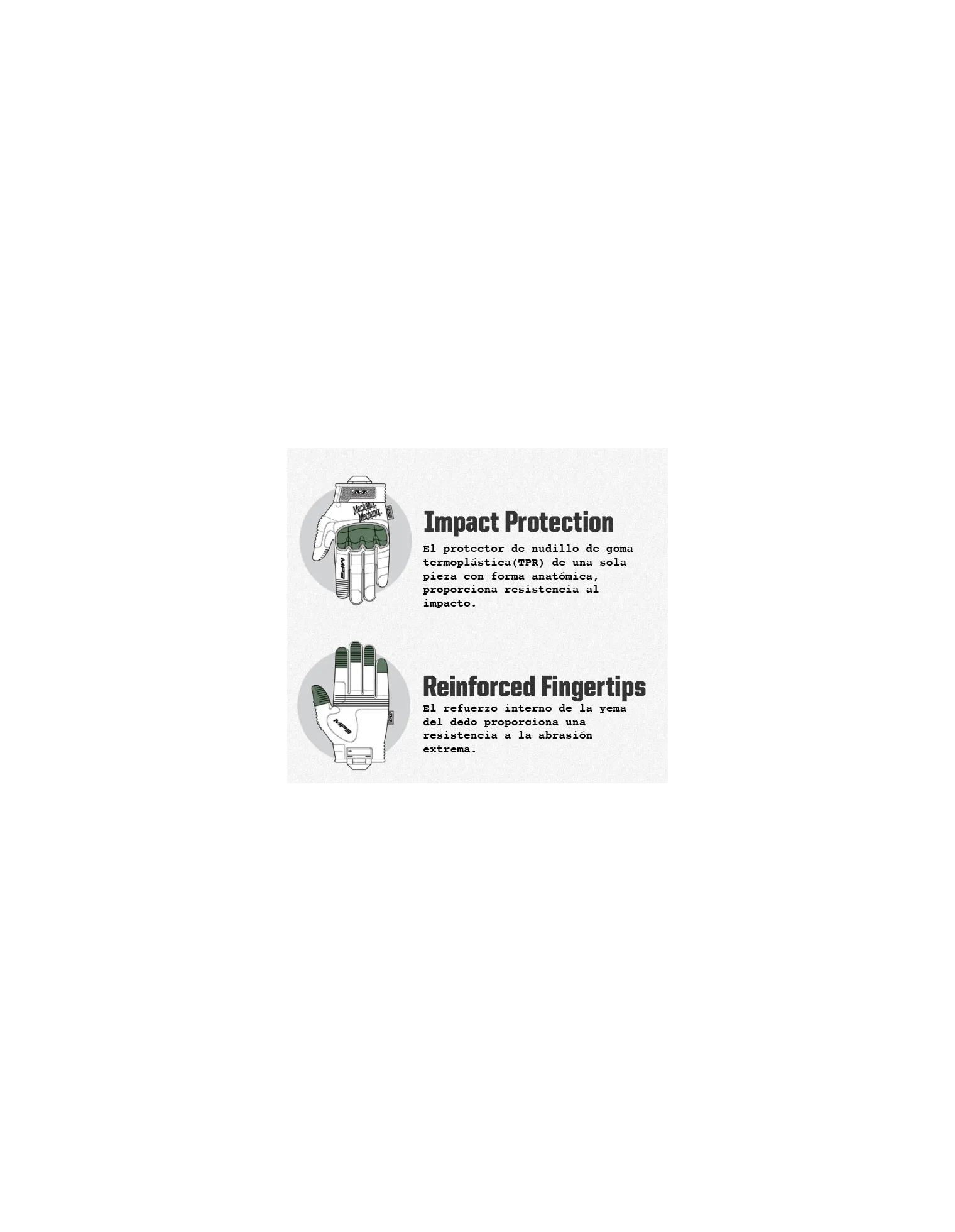 - Refuerzo interno de la yema del dedo proporciona una resistencia a la abrasión extrema.