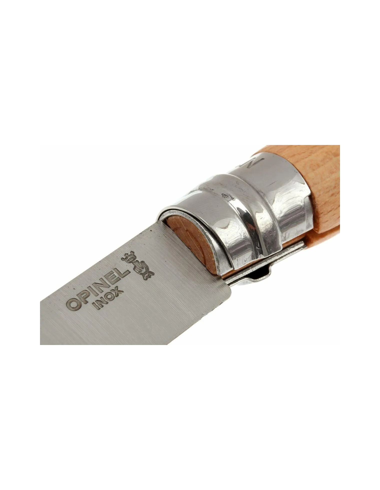 Mango: Haya es la madera más utilizada para la fabricación de mangos Opinel. Procedente de explotaciones francesas, es duro, resistente y fácil de trabajar. De aspecto homogéneo, su color claro varía del amarillo al rosado. Es reconocible por la presencia de muchos pequeños rasgos oscuros. El mango está lacado para estar mejor protegido contra la humedad y la suciedad.