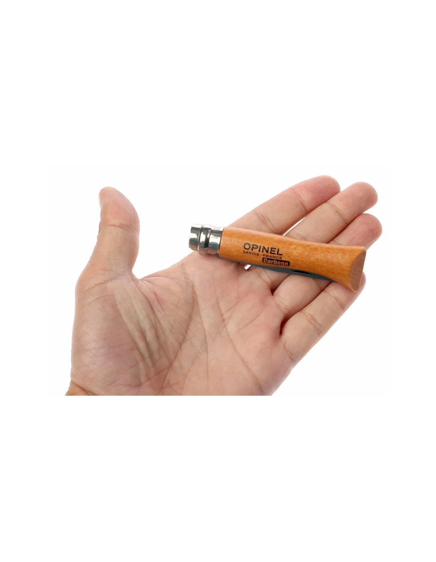 El acero al carbono Opinel es un acero no aleado, con un alto contenido de carbono que permite obtener después de la operación de tratamiento térmico la excelente dureza que garantiza una perfecta sujeción del filo, así como una gran resistencia al desgaste y un fácil afilado. Sin embargo, como el acero al carbono tiene una baja resistencia a la corrosión por humedad, requiere precauciones de uso: no deje su cuchillo en un ambiente húmedo, especialmente en el lavavajillas, limpie la cuchilla con un paño graso después de su uso y engrase a menudo junto con su articulación.
