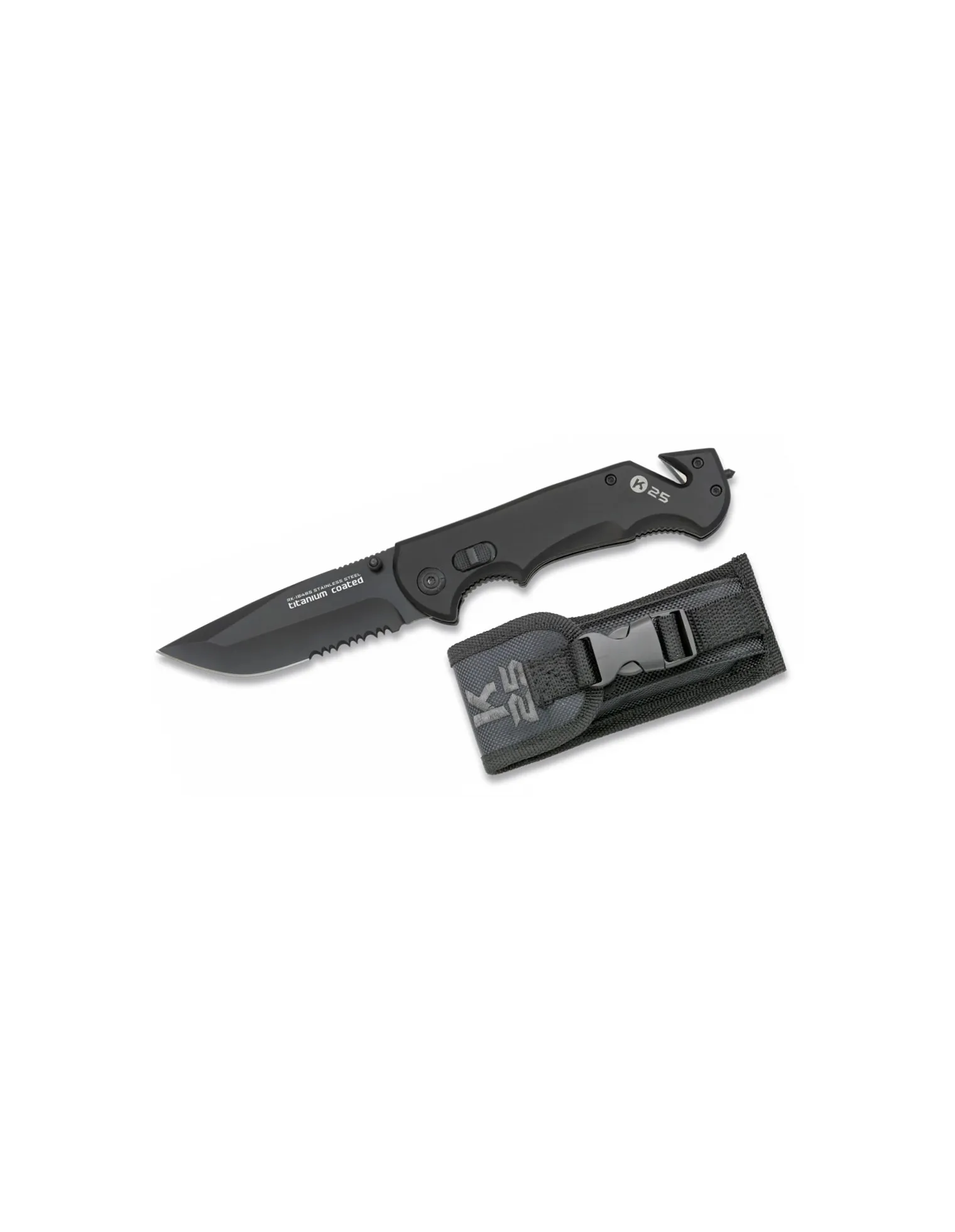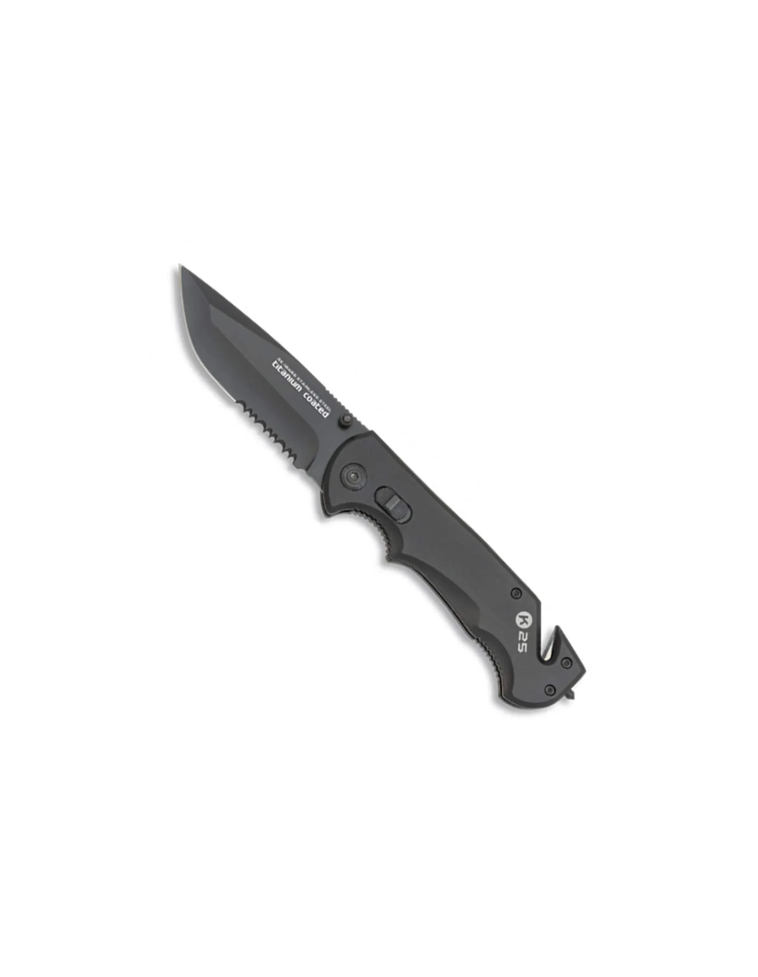 Navaja táctica con filo mixto para servicio policial y militar, con rompe cristales y corta cinturón de seguridad. Pasador en la hoja para facilitar abertura.