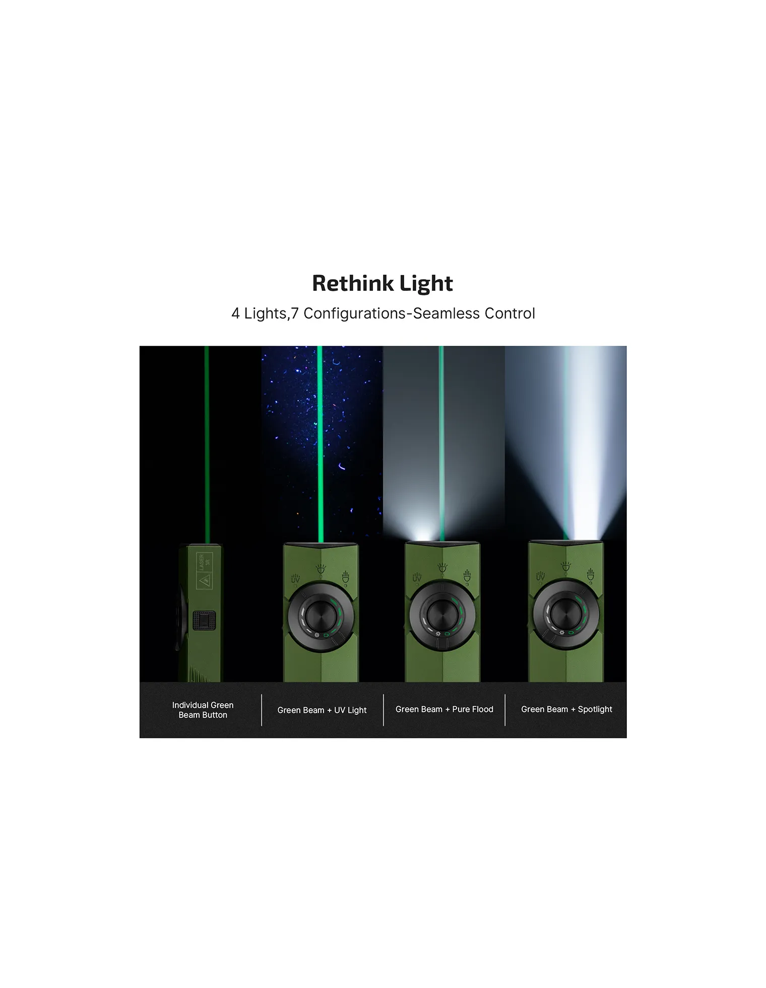 4 luces, 7 configuraciones: Inundación (Pure Flood), foco, UV y láser verde combinables.