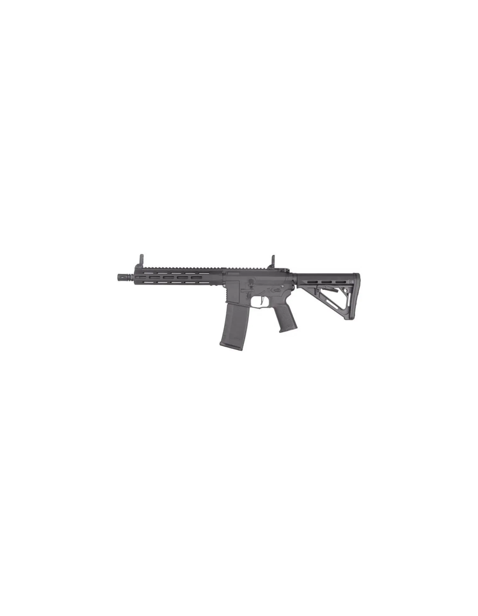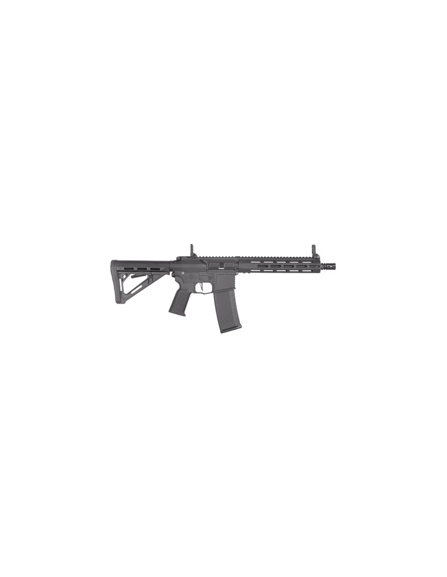 Fabricada con cuerpo de polímero reforzado que es muy robusto y ligero junto a un guardamanos en aluminio CNC con sistema M-Lok. Internamente tiene un gearbox V2 con cambio de muelle rápido y gatillo electrónico con sensores por imán que permiten usar baterías de 11.1V y tener una muy buena respuesta de tiro. También dispone de un pistón reforzado con todos los dientes metálicos y casquillos de 8mm para garantizar una buena durabilidad.