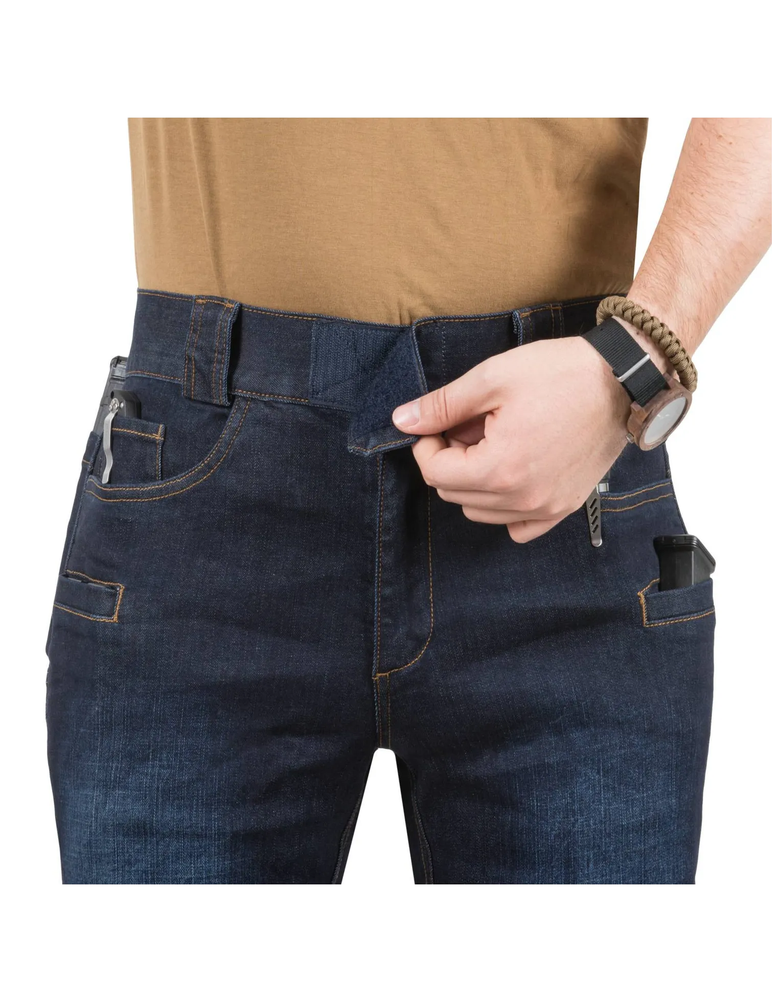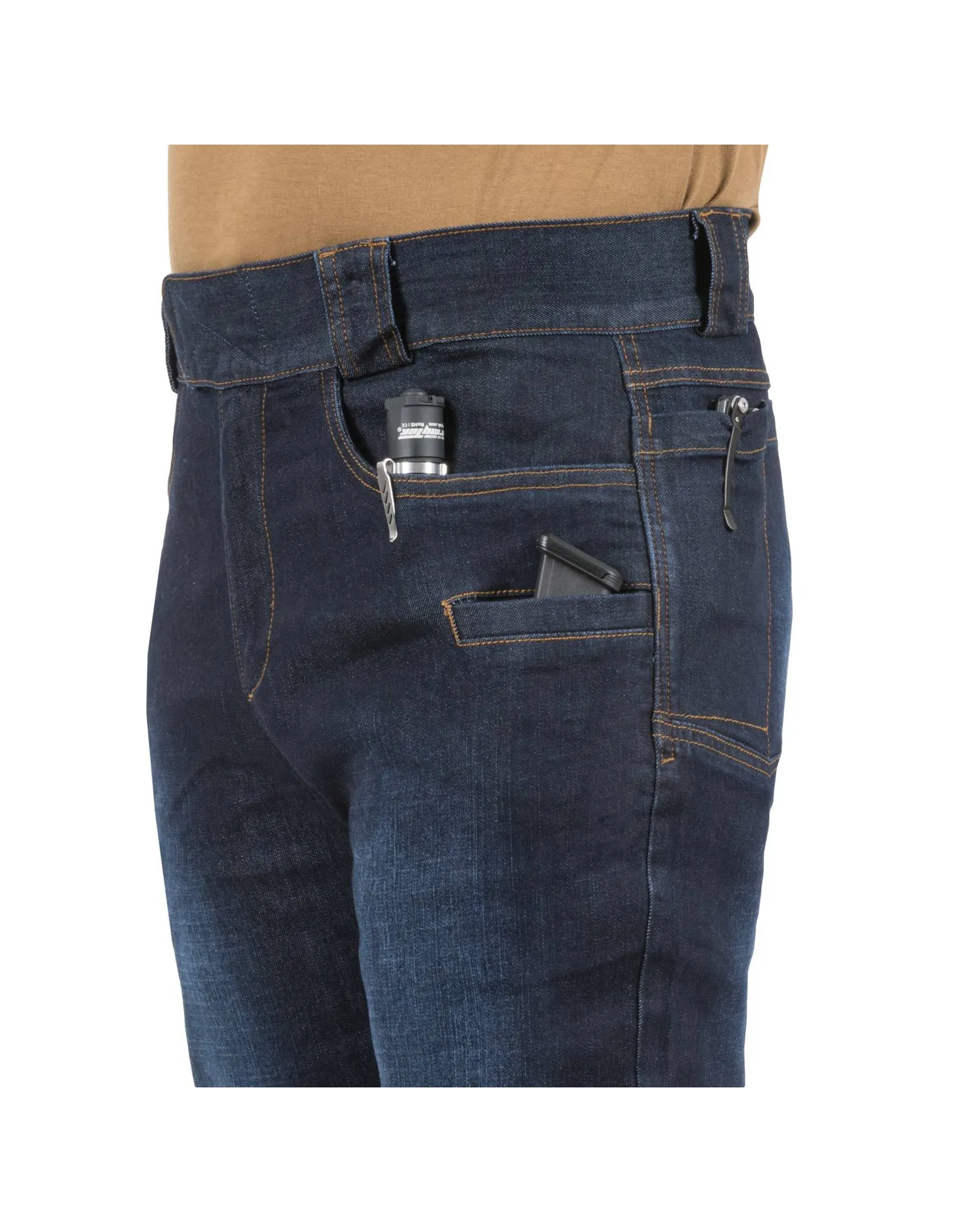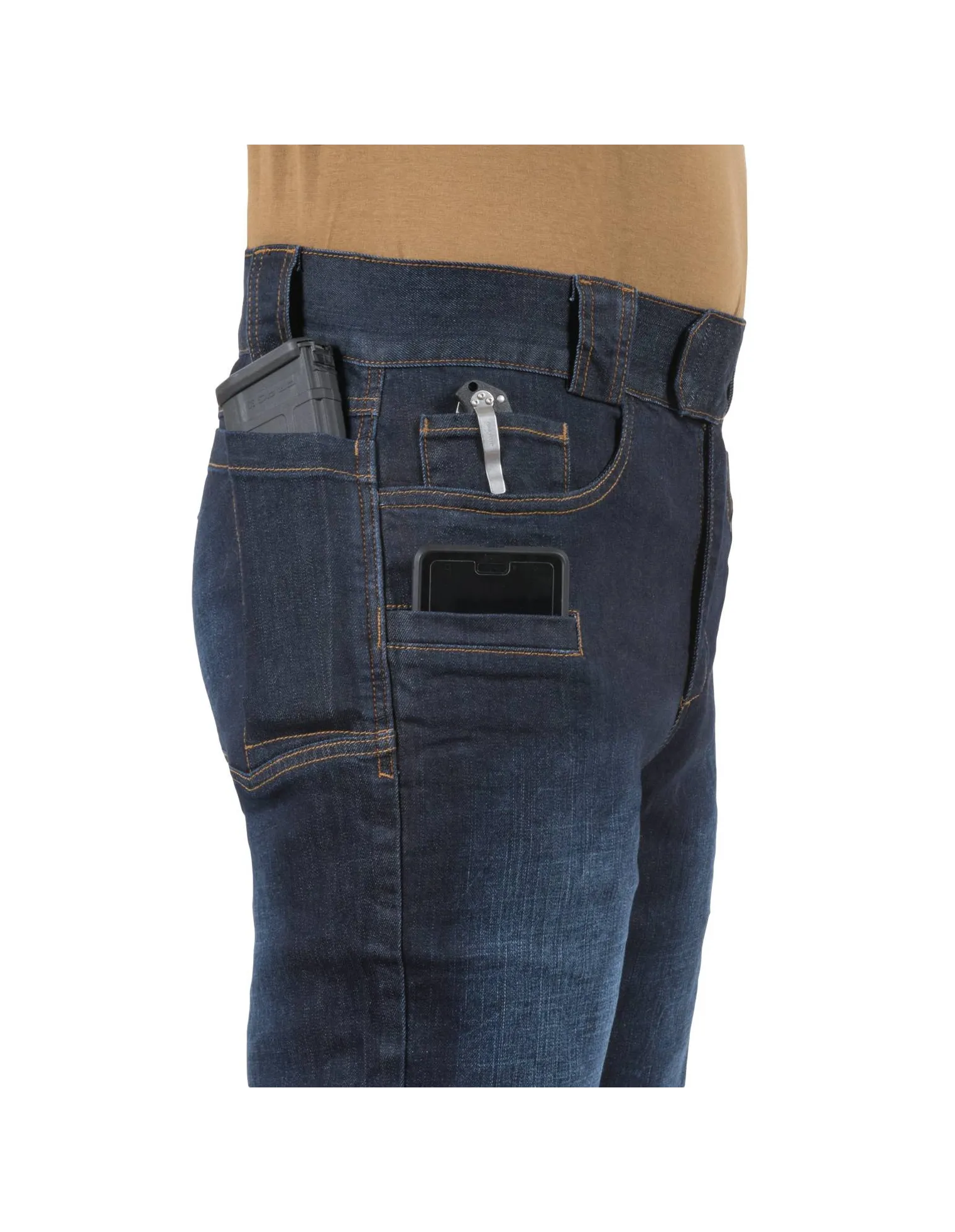 Los Greyman Tactical Jeans® son una combinación de las características tácticas con un aspecto de perfil bajo (discreción). El refuerzo en la entrepierna proporciona facilidad de movimiento y mayor durabilidad. El cinturón integral es elástico y se abrocha mediante con velcro para permitir el ajuste. Las presillas de cinturón admite un cinturón de hasta 50 mm de ancho ideal para ceñidores tácticos. Nueve bolsillos: dos bolsillos clásicos principales en la parte delantera, dos bolsillos delanteros más pequeños, cuatro en la parte posterior y uno dentro del bolsillo frontal derecho. .