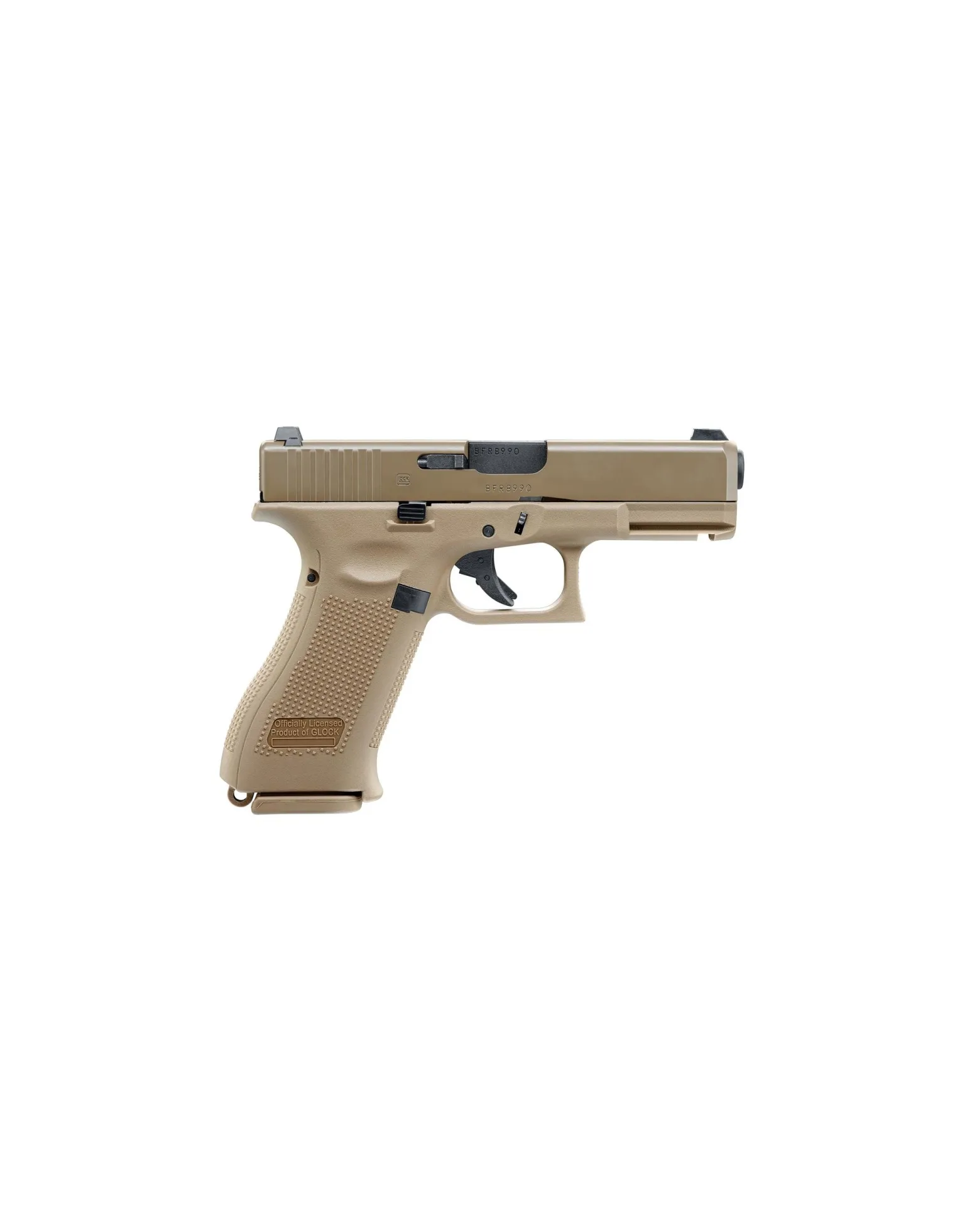 GLOCK describe la G19X como su primera "pistola crossover". Combina el marco de la G17 con la corredera compacta de la G19. Tiene un color especial (color coyote), que rápidamente diferencia esta pistola de otros modelos. Versión con licencia, es una auténtica réplica con las dimensiones y marcas exactas a la original.