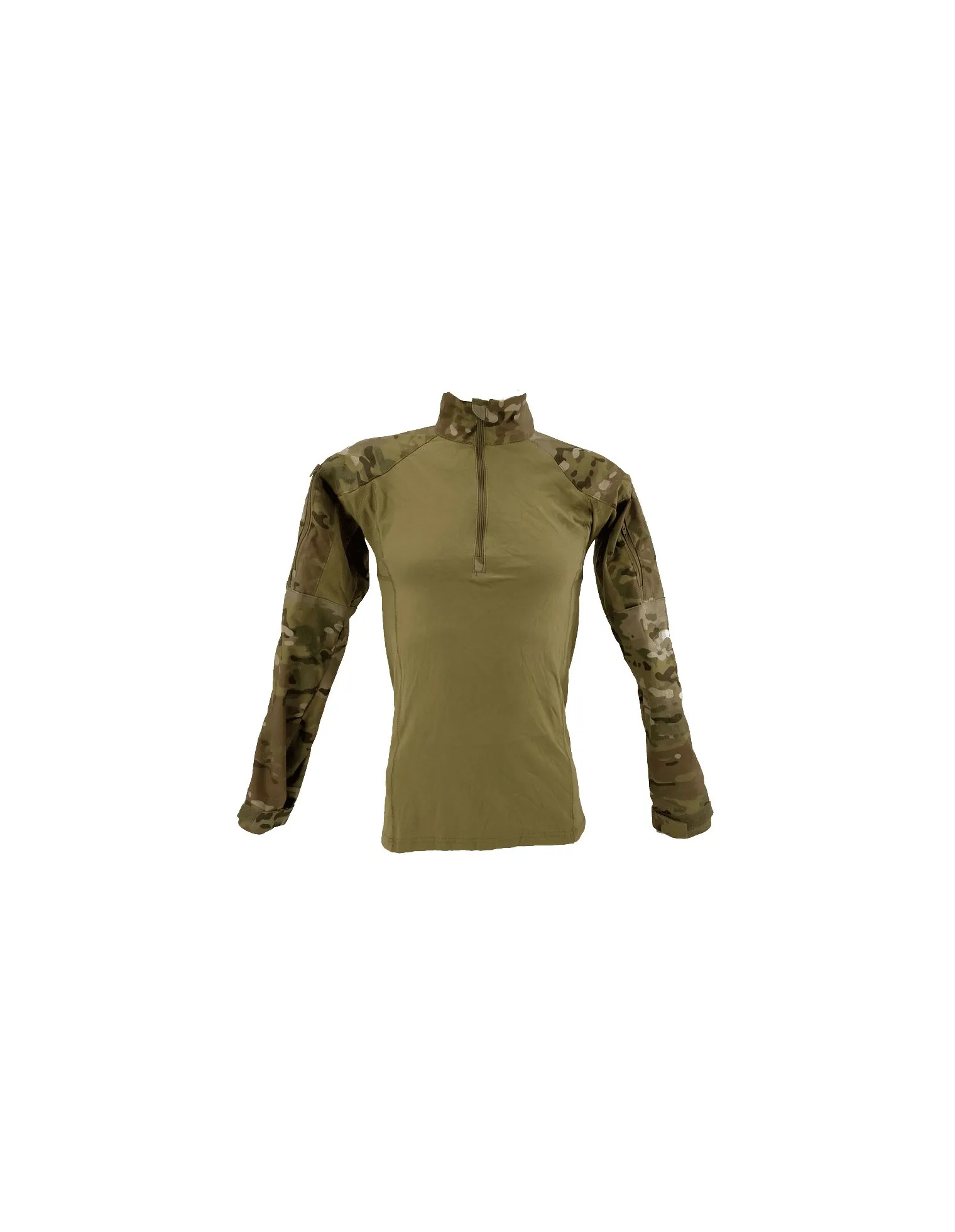 Camisa con doble bolsillo de cremallera, porta bolígrafos y velcros en los hombros.
